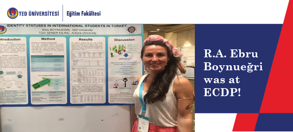 İngiliz Dili Eğitimi Anabilim Dalı Araştırma Görevlilerimizden Ebru Boynueğri, Atina’da düzenlenen 19. Avrupa Gelişim Psikolojisi Konferansında “Türkiye’deki Uluslararası Öğrencilerin Kimlik Statüleri ve Kültürleşme Stratejilerinde Cinsiyet Farklılıkları” başlıklı çalışmasını poster olarak sundu.