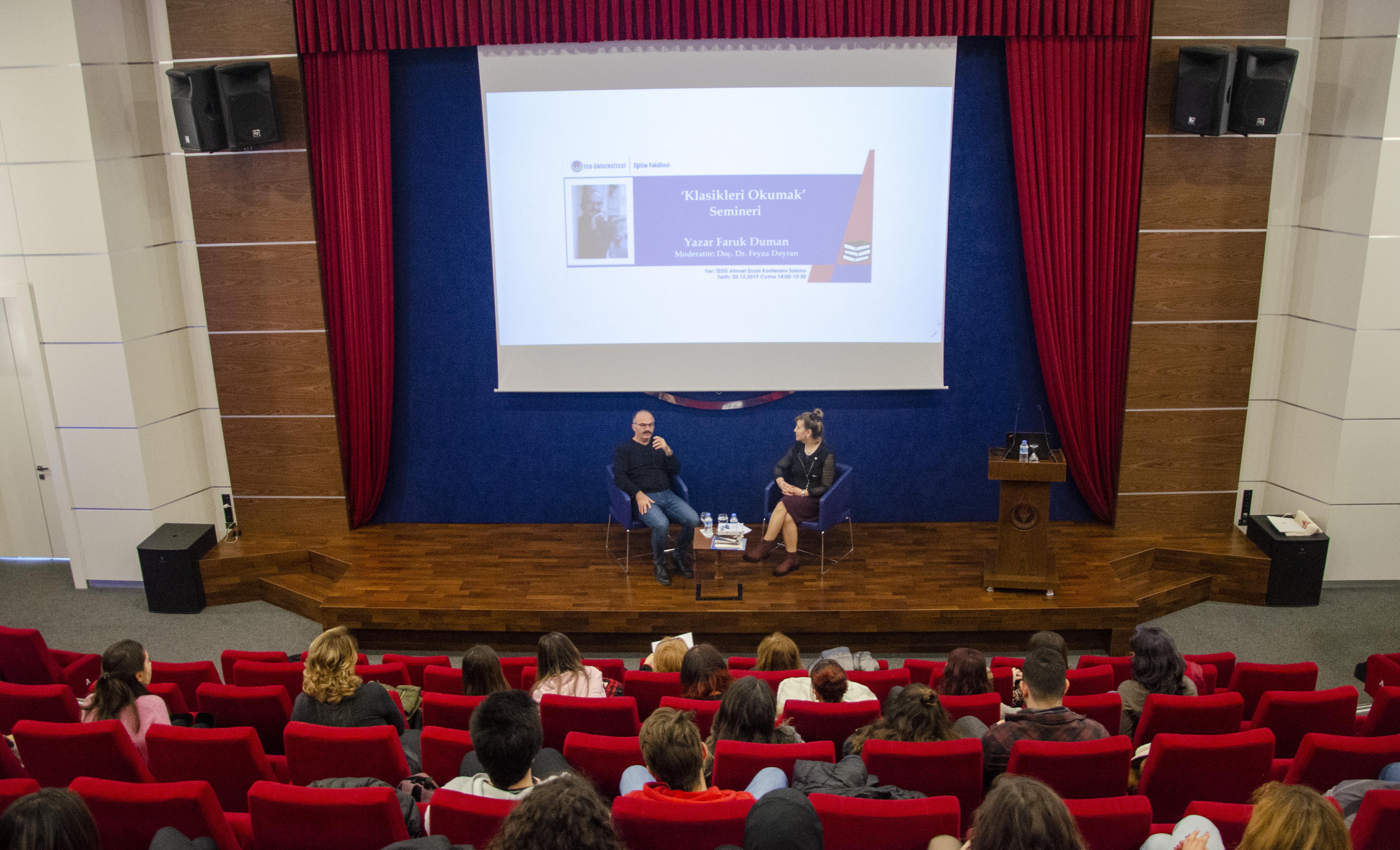 20 Aralık 2019 Cuma günü ünlü Yazar Faruk Duman TED Üniversitesi öğrencileri ile “Klasikleri Okumak” üzerine bir söyleşi yaptı. Doç. Dr. Feyza Doyran’ın moderatörlüğünü yaptığı söyleşi, Eğitim Fakültesi İngilizce öğretmen adaylarının hem kendi kişisel gelişimleri hem de öğretmenlik hayatlarında öğrencilerinin gelişimlerine yardımcı olabilmeleri için onlara ışık tuttu. Öğrencilerin de aktif katılımları, soru ve yorumları ile katıldığı söyleşi, tüm katılımcılarda klasikleri yeniden okuma isteği uyandırdı.