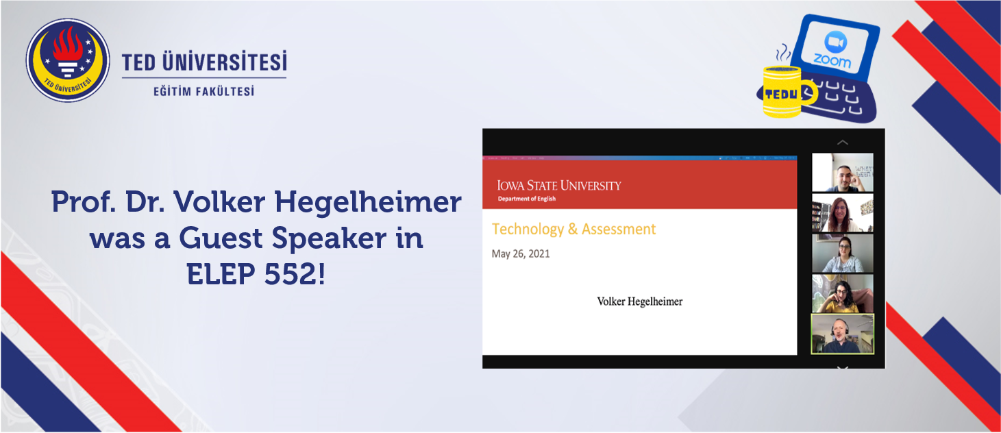 26 Mayıs Çarşamba günü, öğretim üyelerimizden Dr. Zeynep Bilki tarafından yürütülen ELEP 552 Teknoloji Odaklı Dil Edinimi yüksek lisans dersi kapsamında Iowa Eyalet Üniversitesi’nden Prof. Dr. Volker Hegelheimer konuğumuz oldu. Teknoloji ve Dil Değerlendirmesi üzerine bir konuşma veren Prof. Hegelheimer sonrasında yüksek lisans öğrencilerimizin sorularını cevapladı.