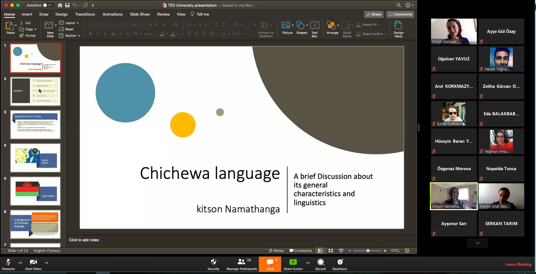 Kitson Namathanga, who speaks eight languages and has a master's degree in Curriculum and Instruction at Gazi University, attended as a guest speaker in ELEP 204 Linguistics II Class, conducted by Assoc. Prof. Dr. Sinem Sonsaat-Hegelheimer and Assoc. Prof. Dr. Melike Ünal-Gezer. He informed our students about the structure of the three languages he spoke (Chichewa, Xhosa, Zulu). During the presentation, students who took notes about the pronunciation features of these languages shared their notes with their friends the following week.